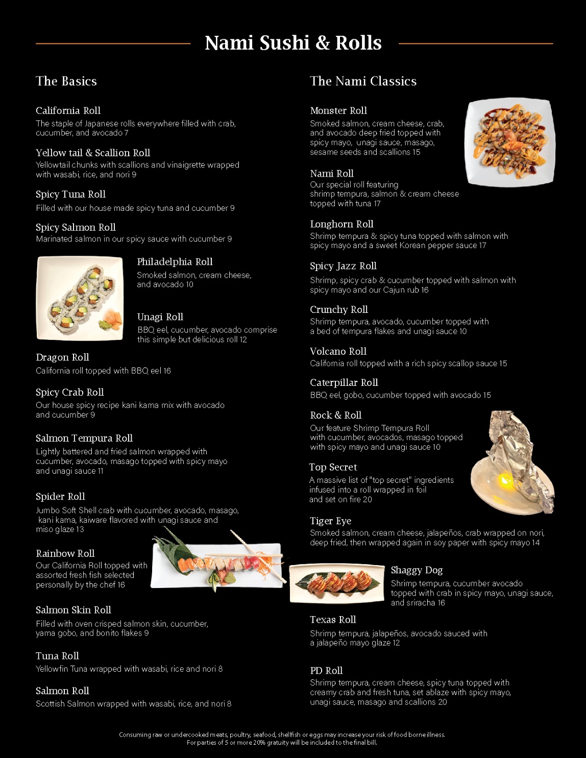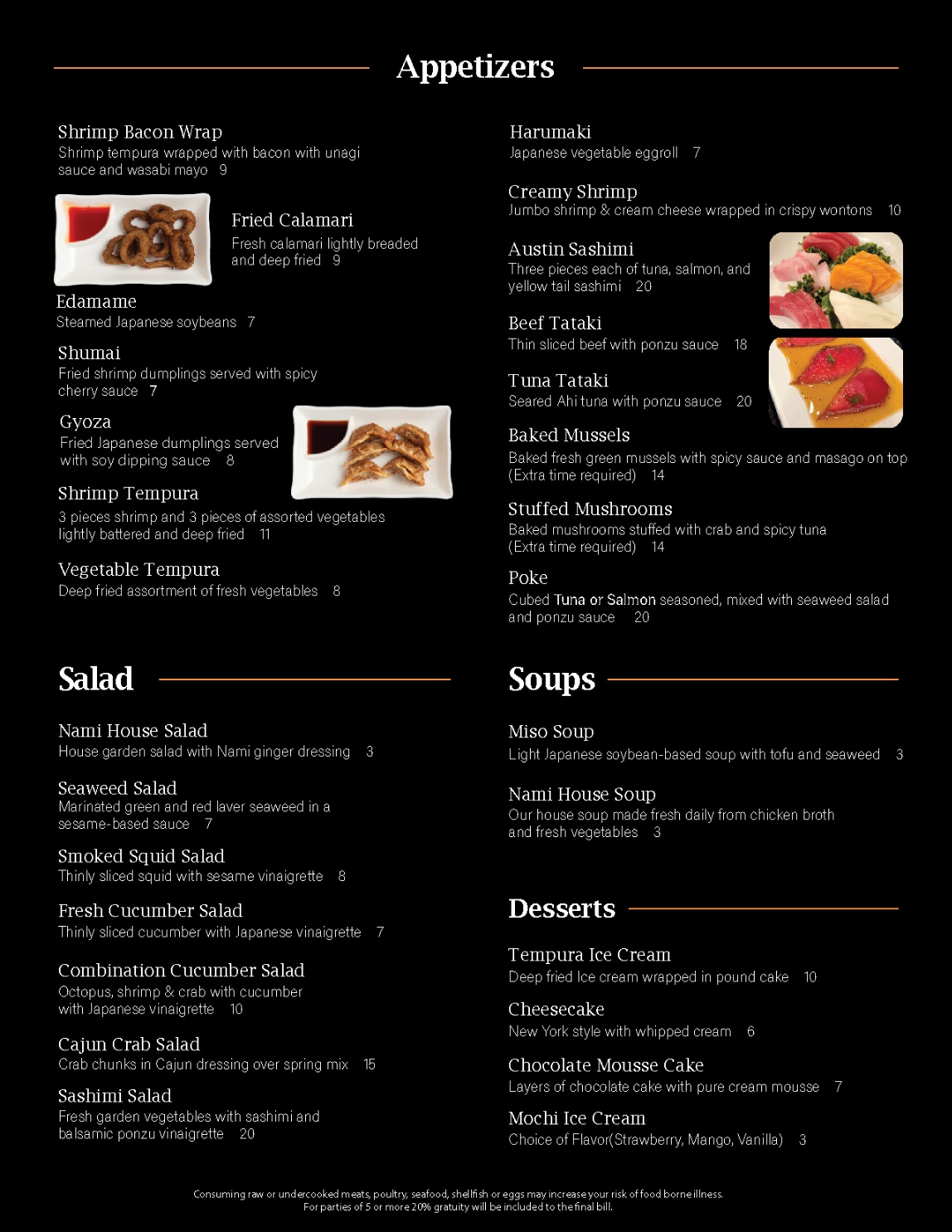 For parties of 5 or more 20% gratuity will be included to the final bill